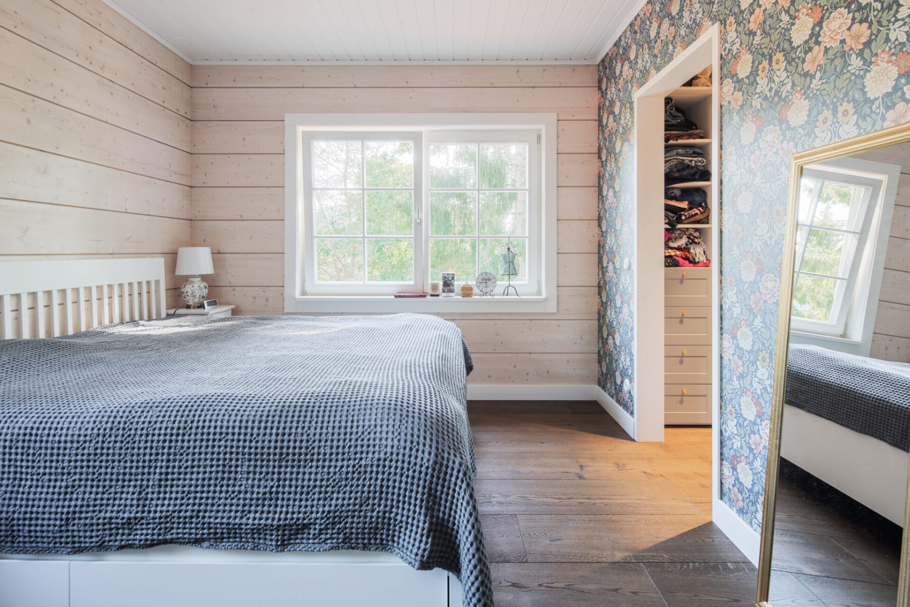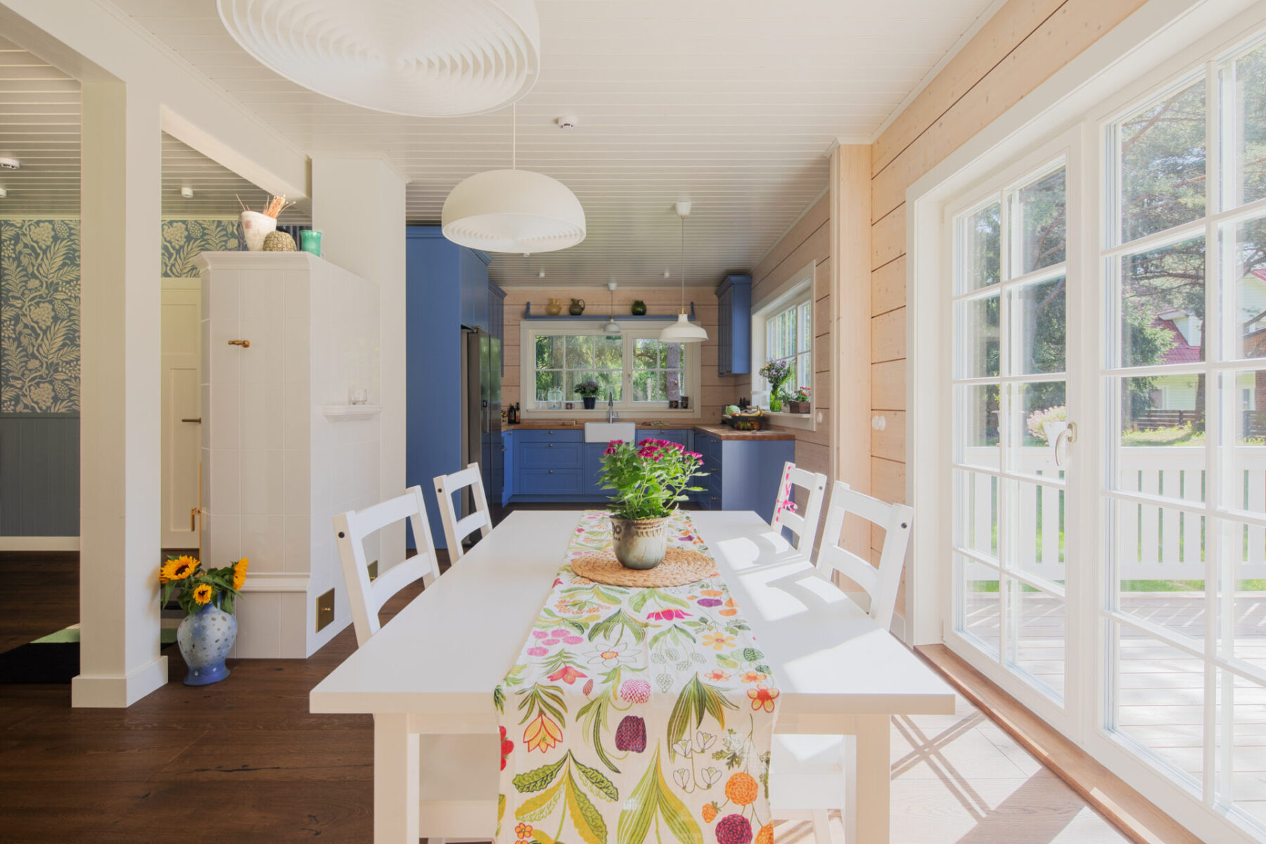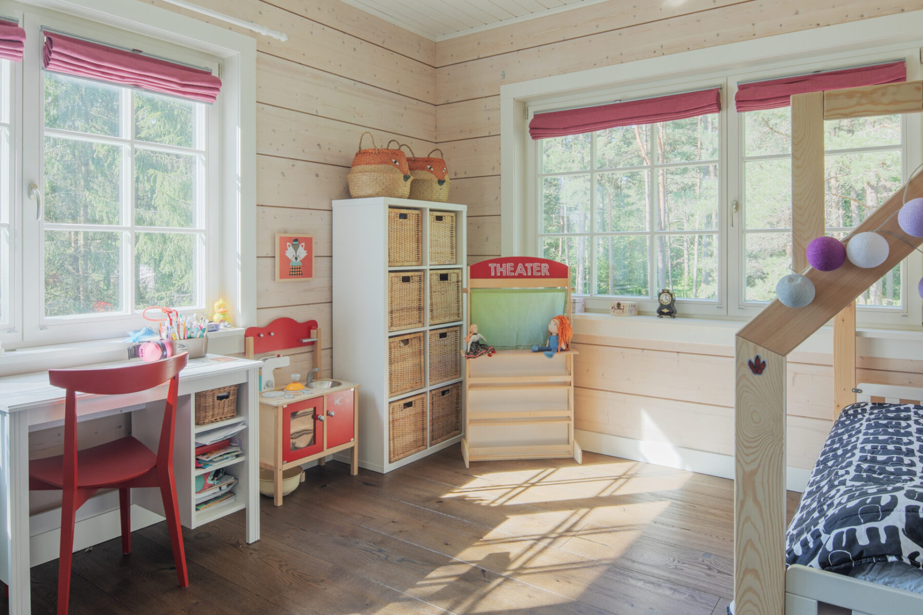 Оскільки земельна ділянка не отримує багато світла, а родина хотіла зберегти якомога більше дерев на подвір’ї, вони вирішили розширити віконний простір. «Я хотіла відчуття, що коли ти в кімнаті і дивишся у вікно, то зливаєшся з зовнішнім середовищем», — описує Марі свої побажання.