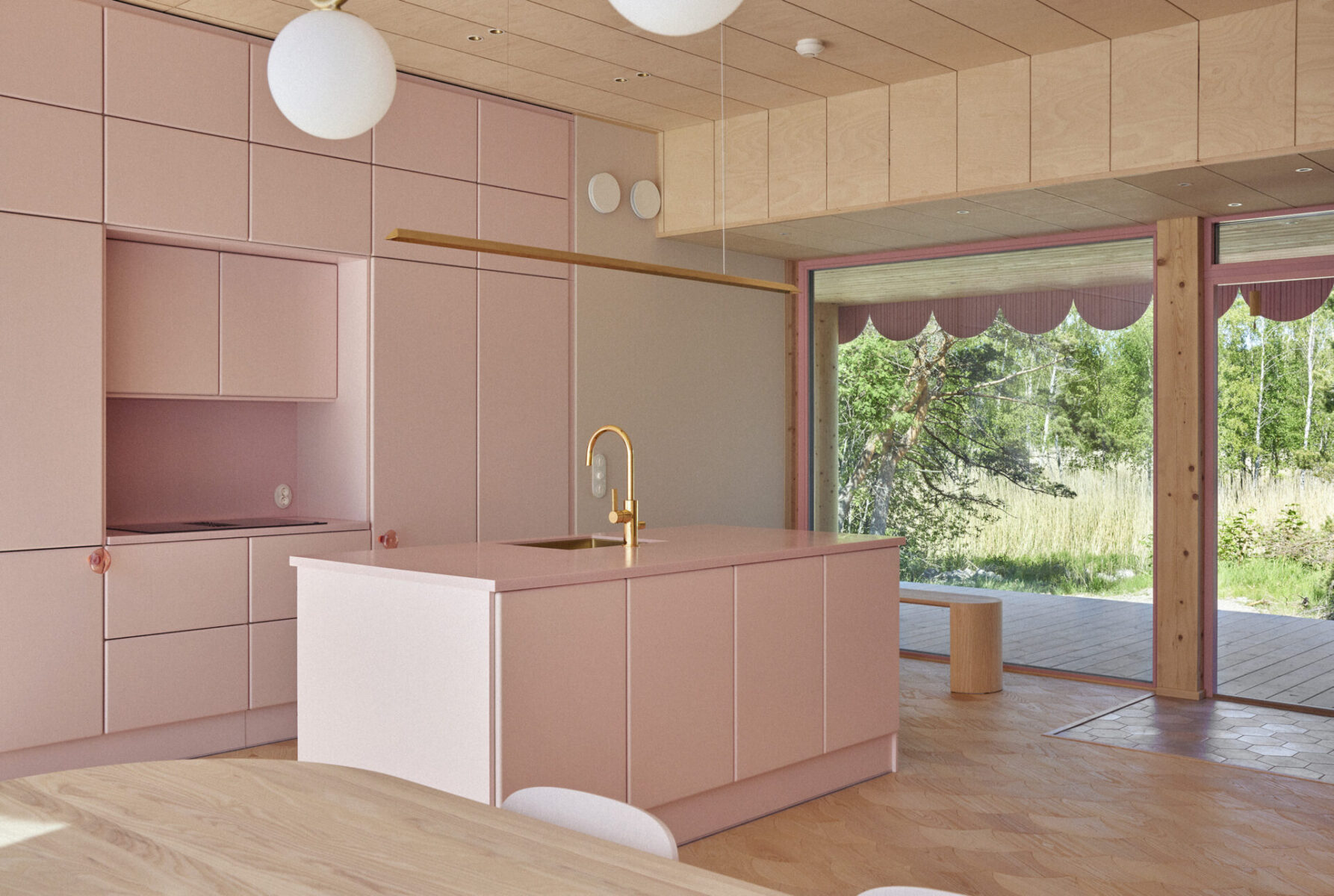Терасна дошка виготовлена з фінської деревини, але була замовлена з Данії, оскільки замовниця хотіла мати спеціально оброблений, екологічний матеріал, який би витримував погодні зміни та умови — близькі до моря, високу вологість і сильні вітри.