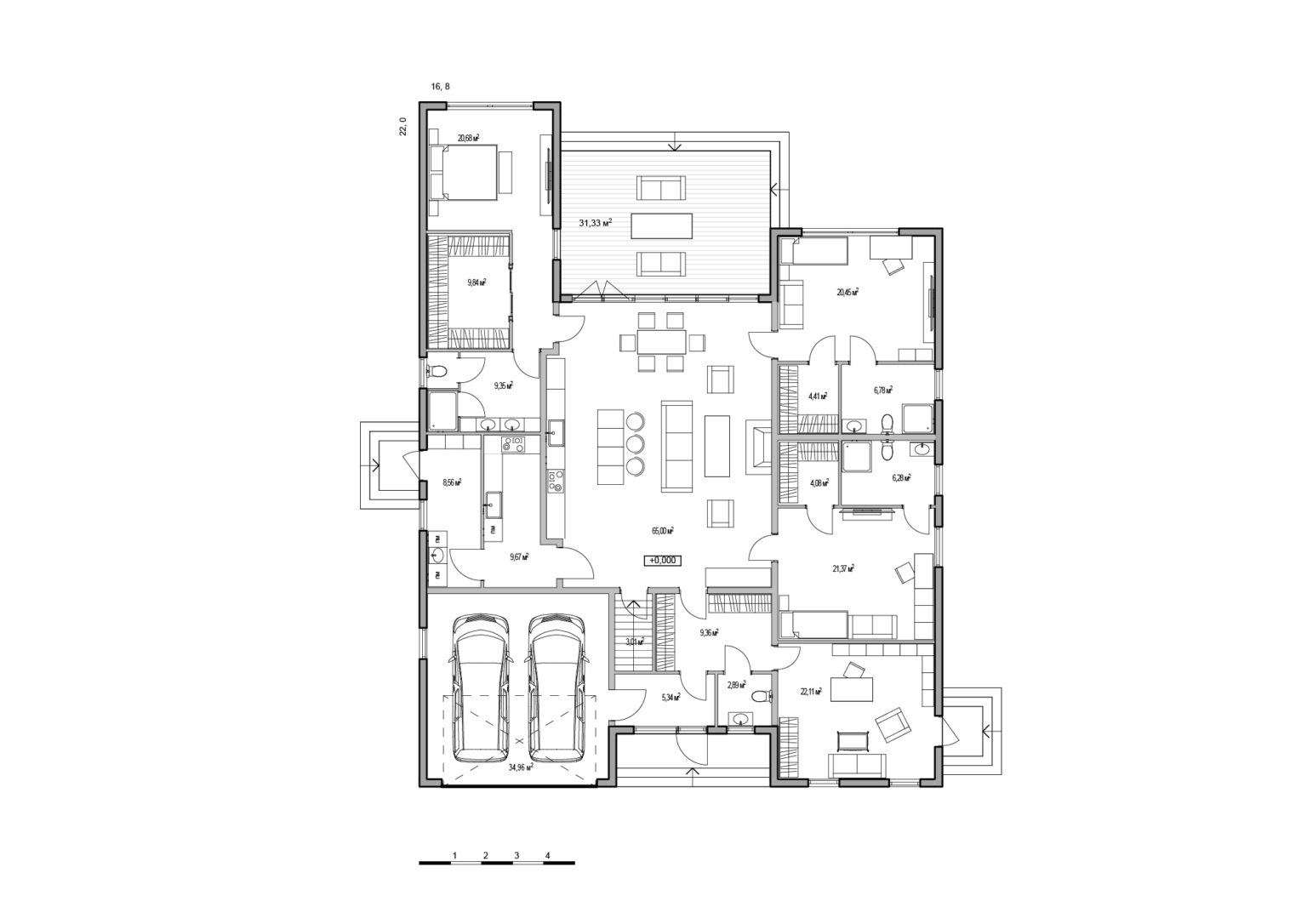 Через вхідний тамбур можна потрапити в гараж на два авто. Під приміщенням гаражу передбачене укриття, розміри та наповнення якого залежать тільки від ваших потреб та можливостей. Зона укриття спеціально облаштована з краю будинку, аби мати можливість зробити другий вихід на поверхню на віддаленні від основної будівлі.