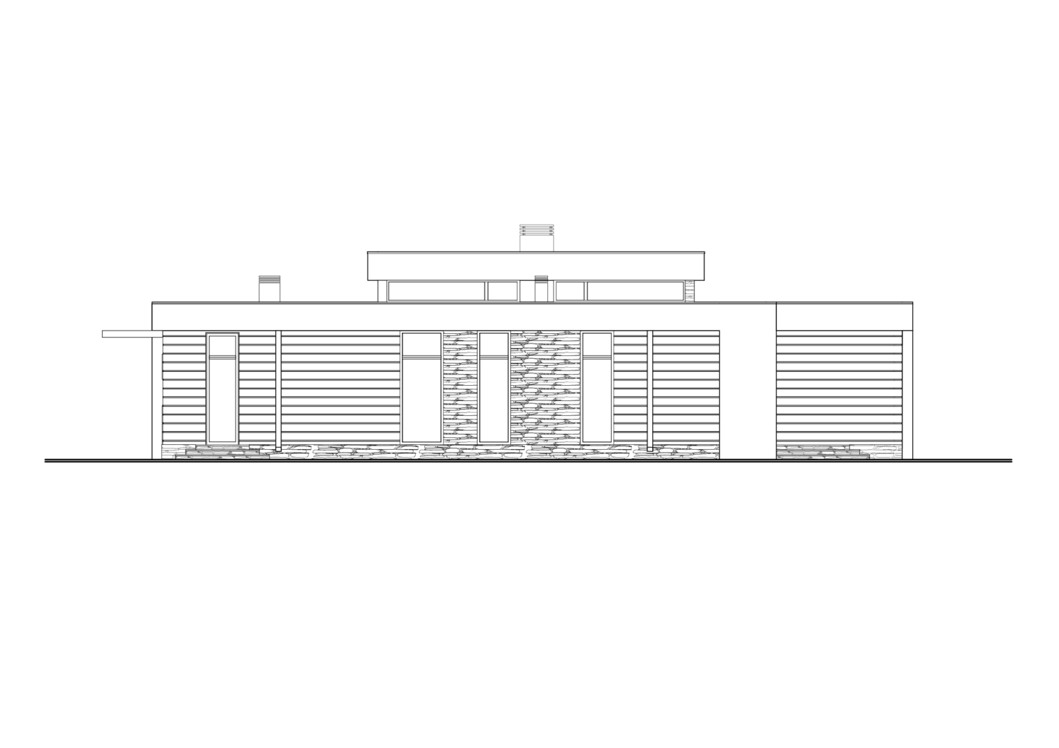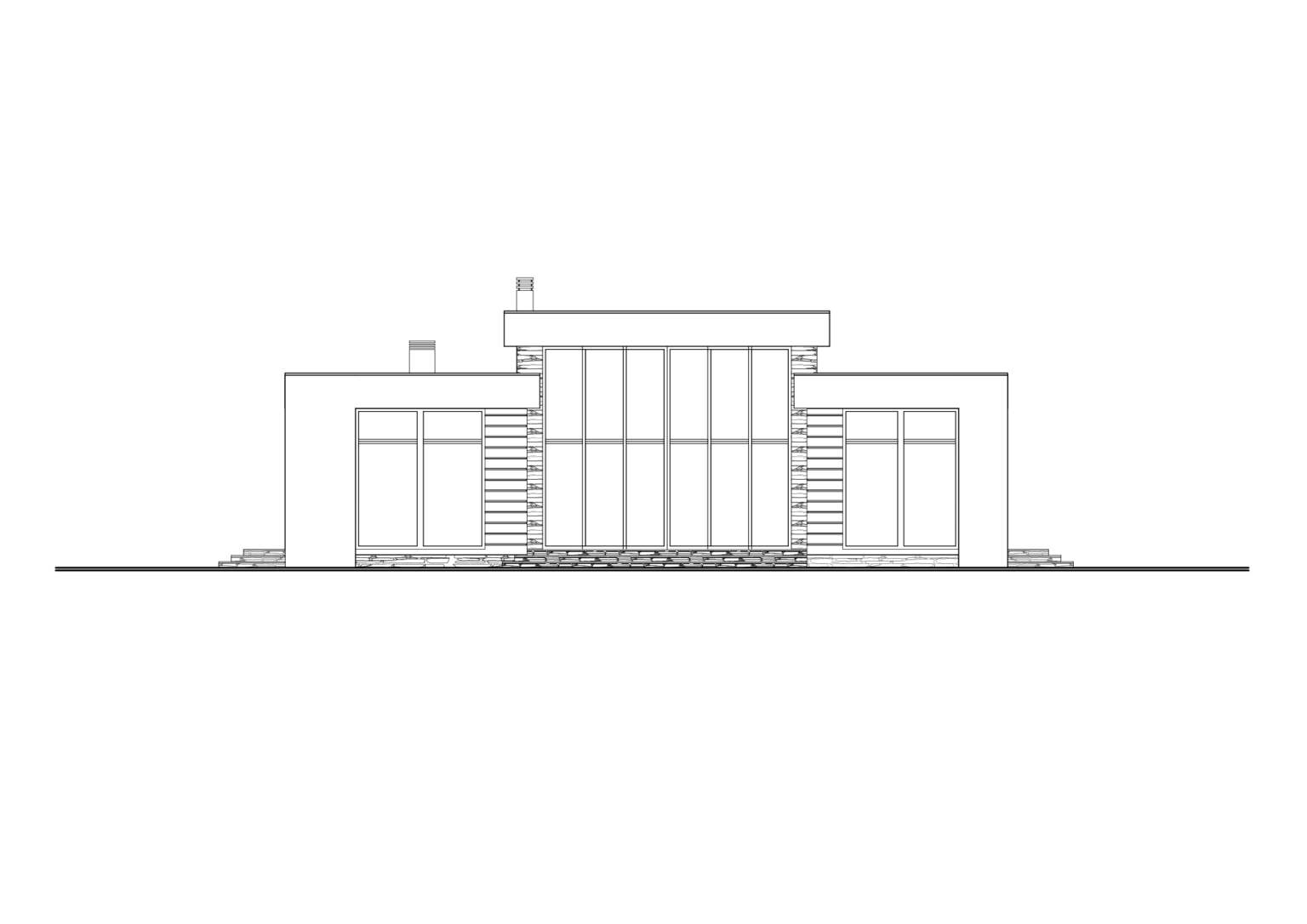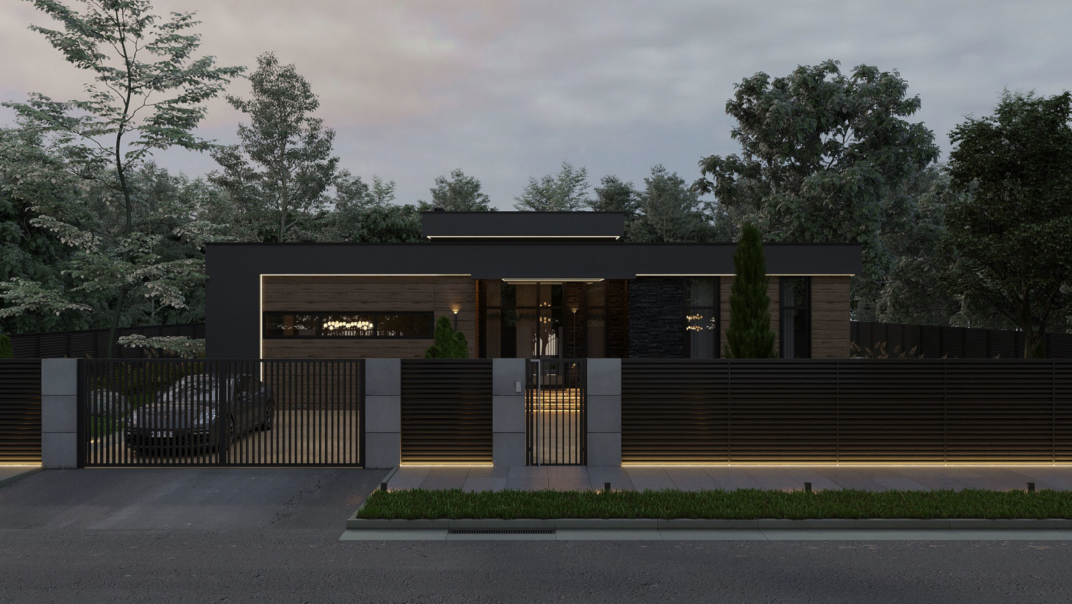 Виконаний у сучасній стилистиці з використанням дерева, метала і натурального каміння з великими вікнам, будинок ніби розчиняється у природному середовищі.