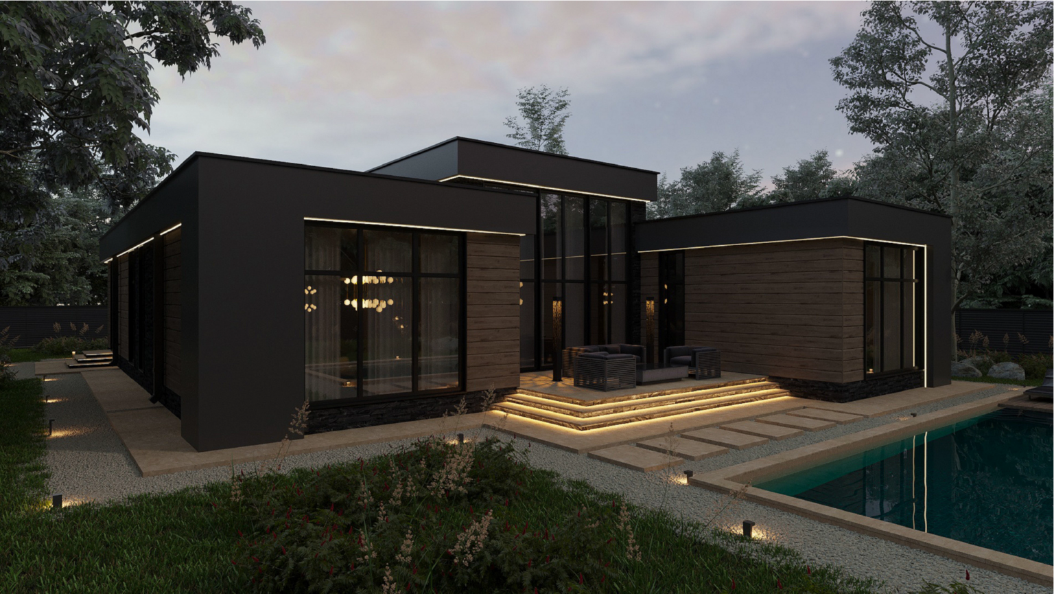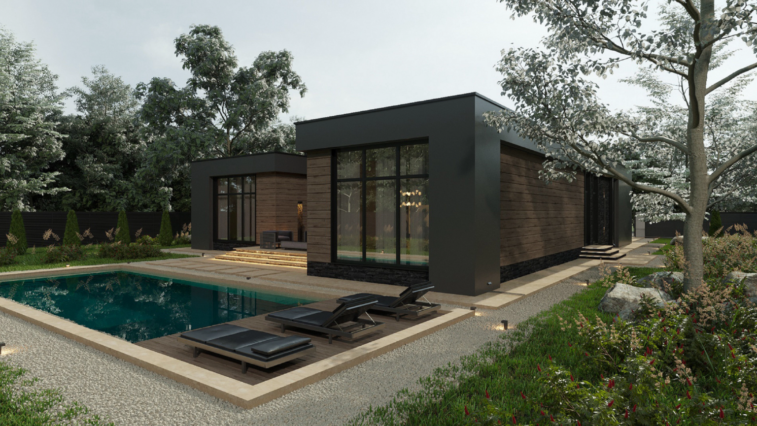 Проєкт Khionia — це продовження серії сучасних одноповерхових дерев’яних вілл, розроблений українським архітектором Дмитром Фоменком.