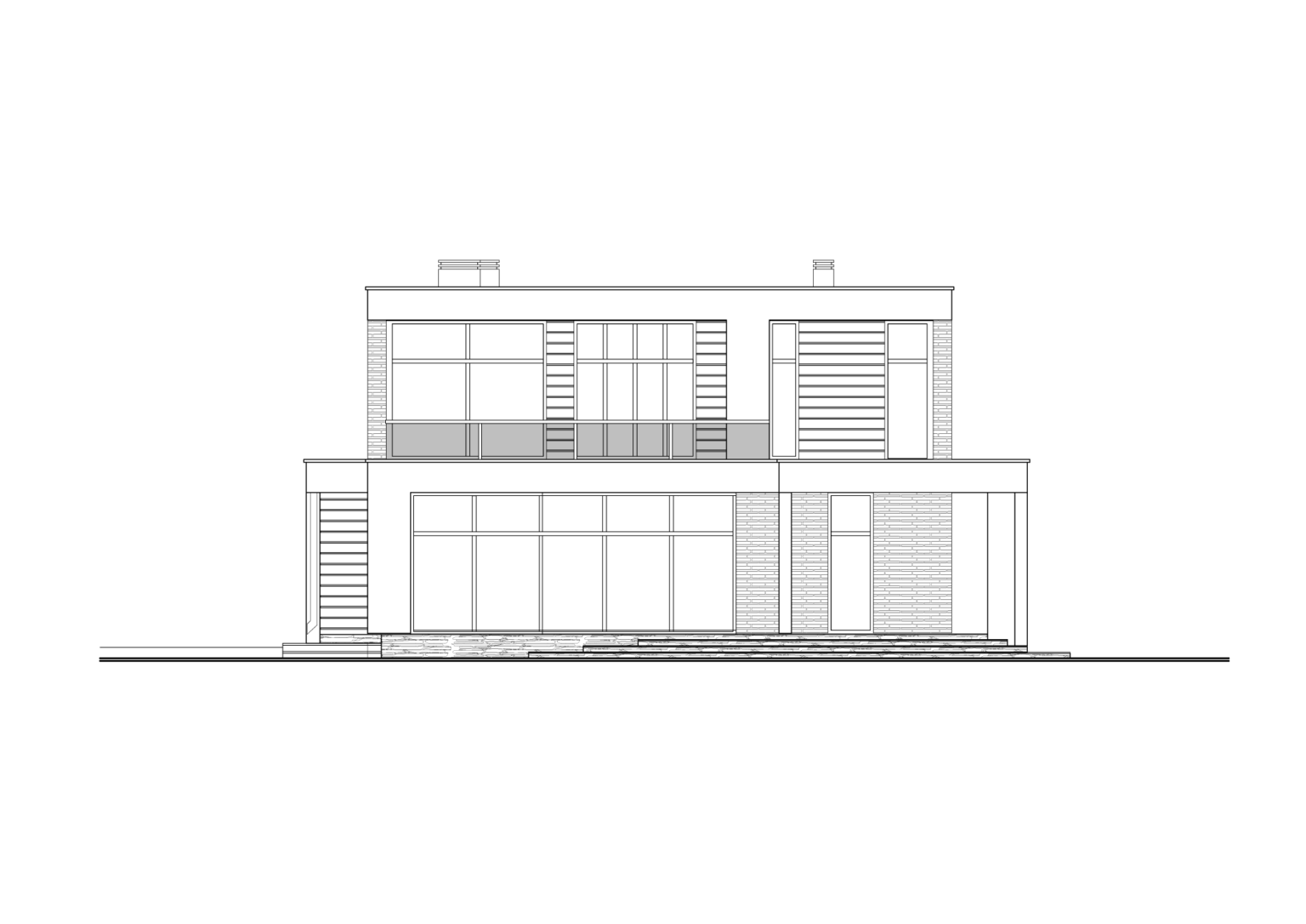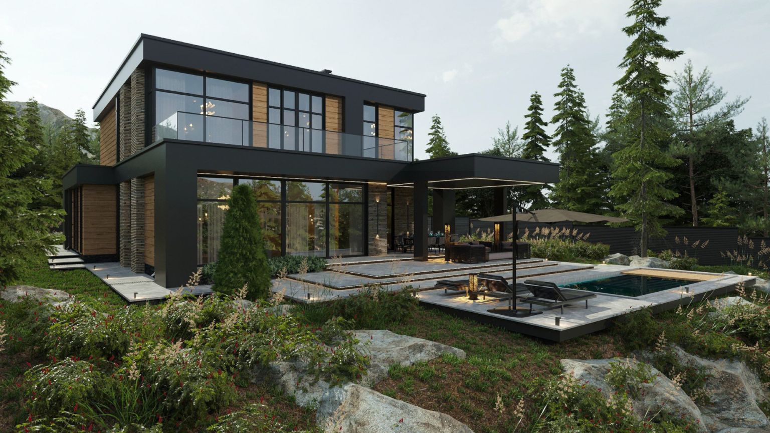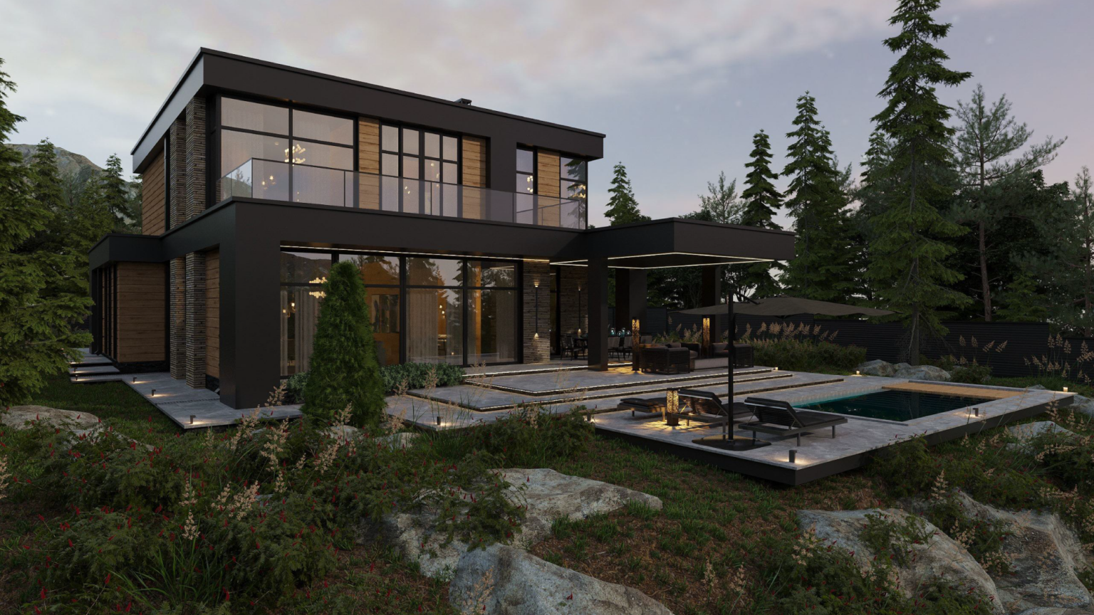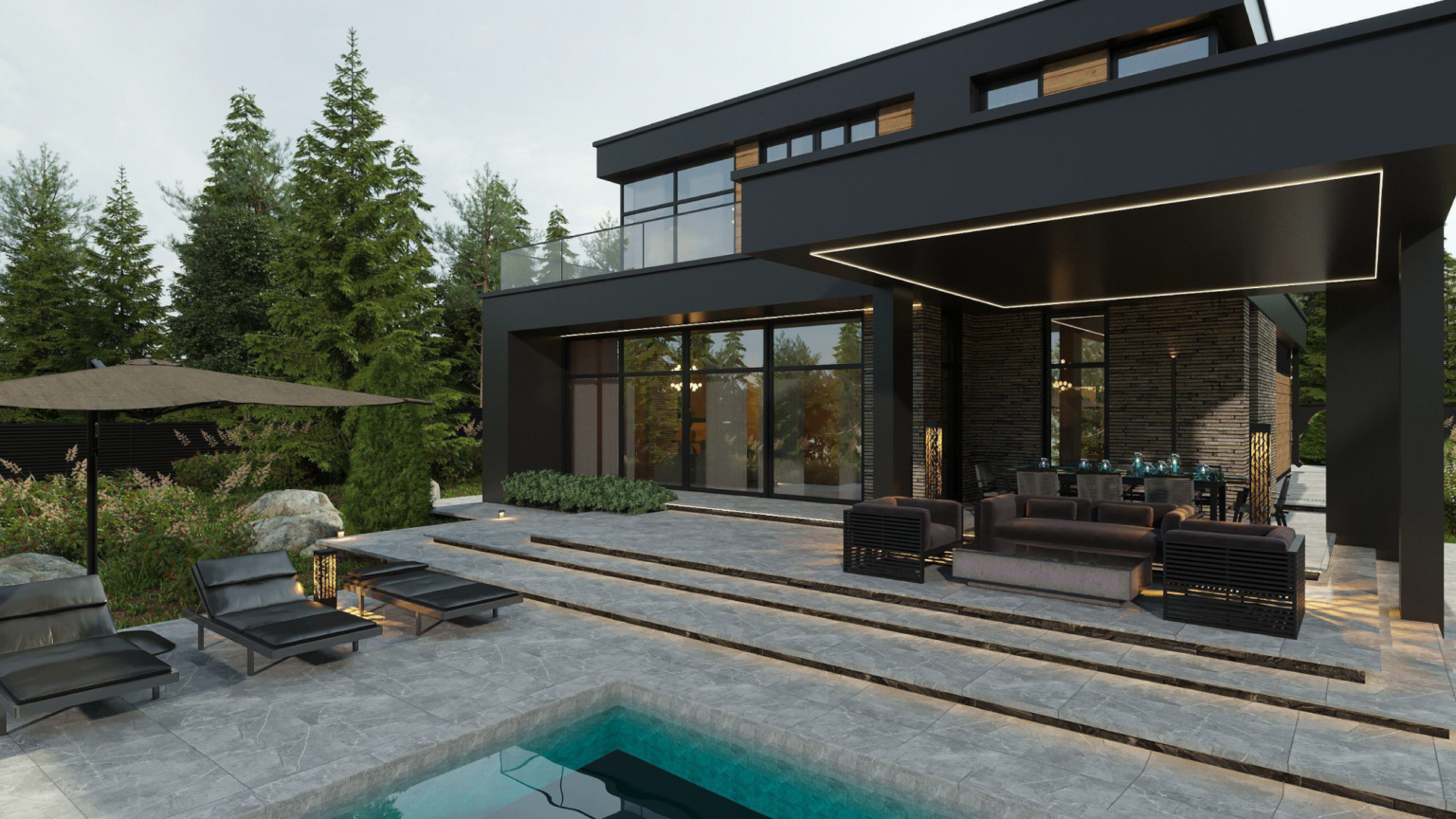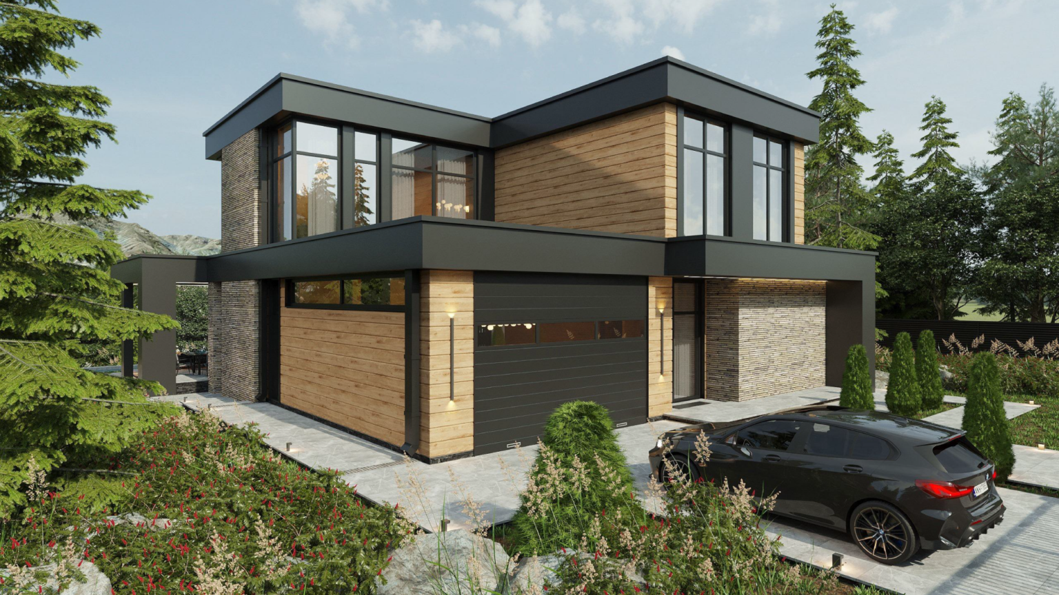 Lavryn — це двоповерховий будинок у сучасному стилі з клеєного брусу, зовні оздоблений металом та натуральним каменем. Будинок розрахований на велику родину, і має продумане планування для різноманітних сценаріїв щоденної рутини і святкових подій.