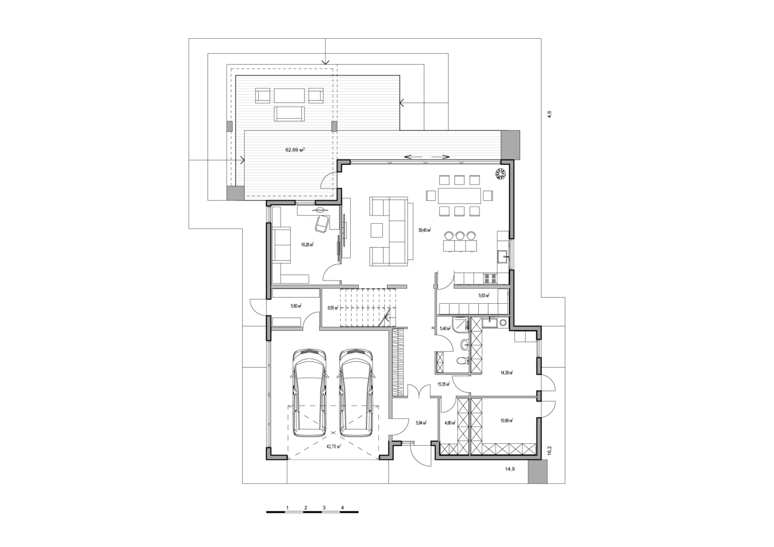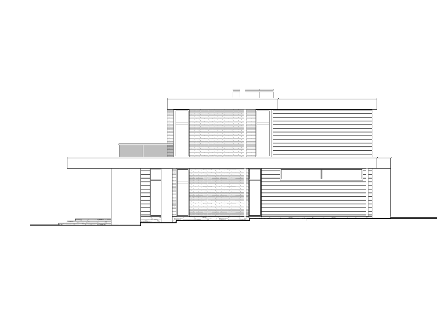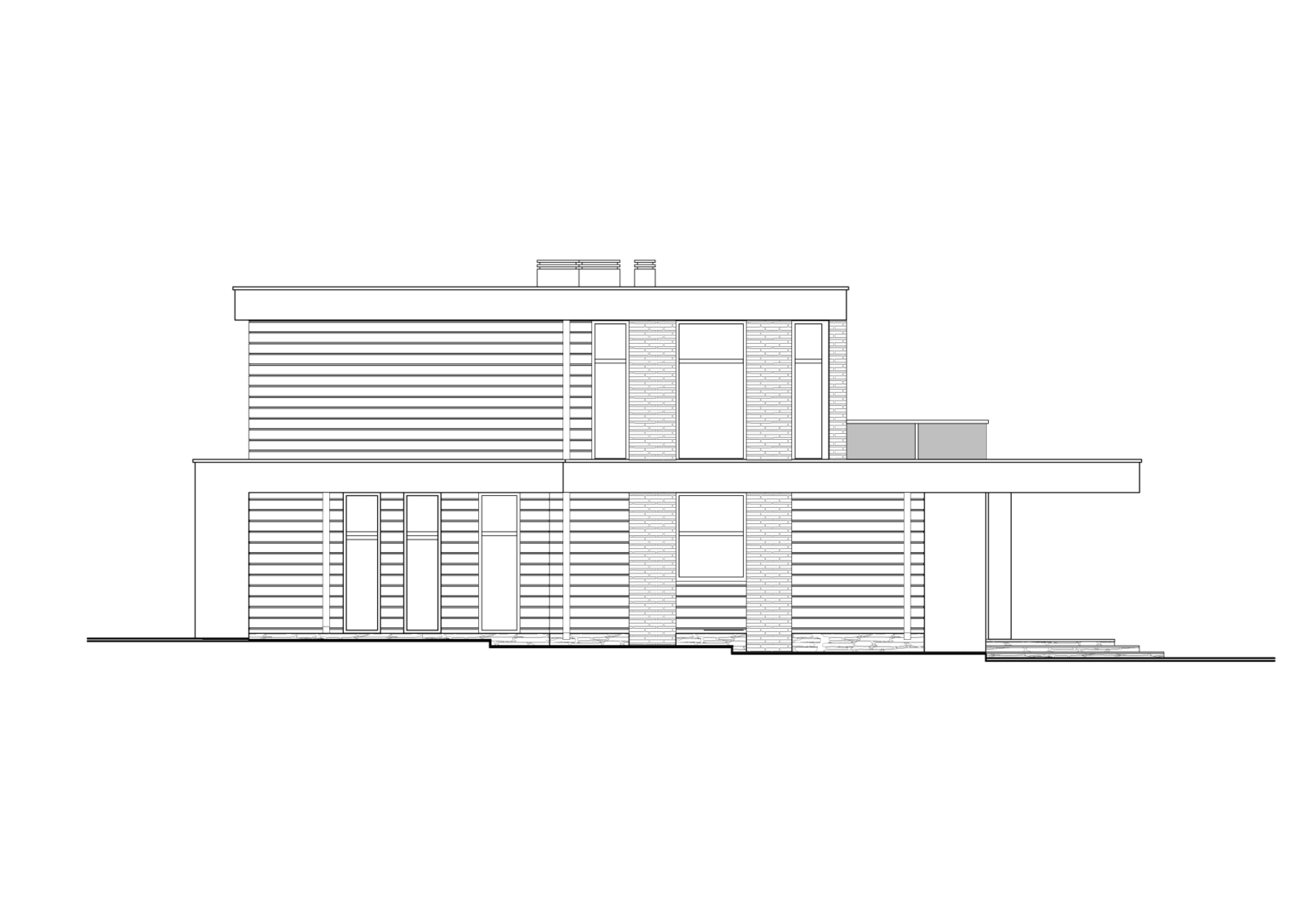 Перший поверх будинку відведено для зони відпочинку та різноманітних побутових приміщень. Велика вітальня складається з трьох зон: зона для спілкування та відпочинку, кухня та велика їдальня. Звідси можна потрапити у великий кабінет, і вийти на велику криту терасу, що розташована вздовж внутрішнього фасаду. Поруч також є санвузол, а кухня має додаткове приміщення, аби мати можливість готувати ароматні страви, не заважаючи оточуючим.