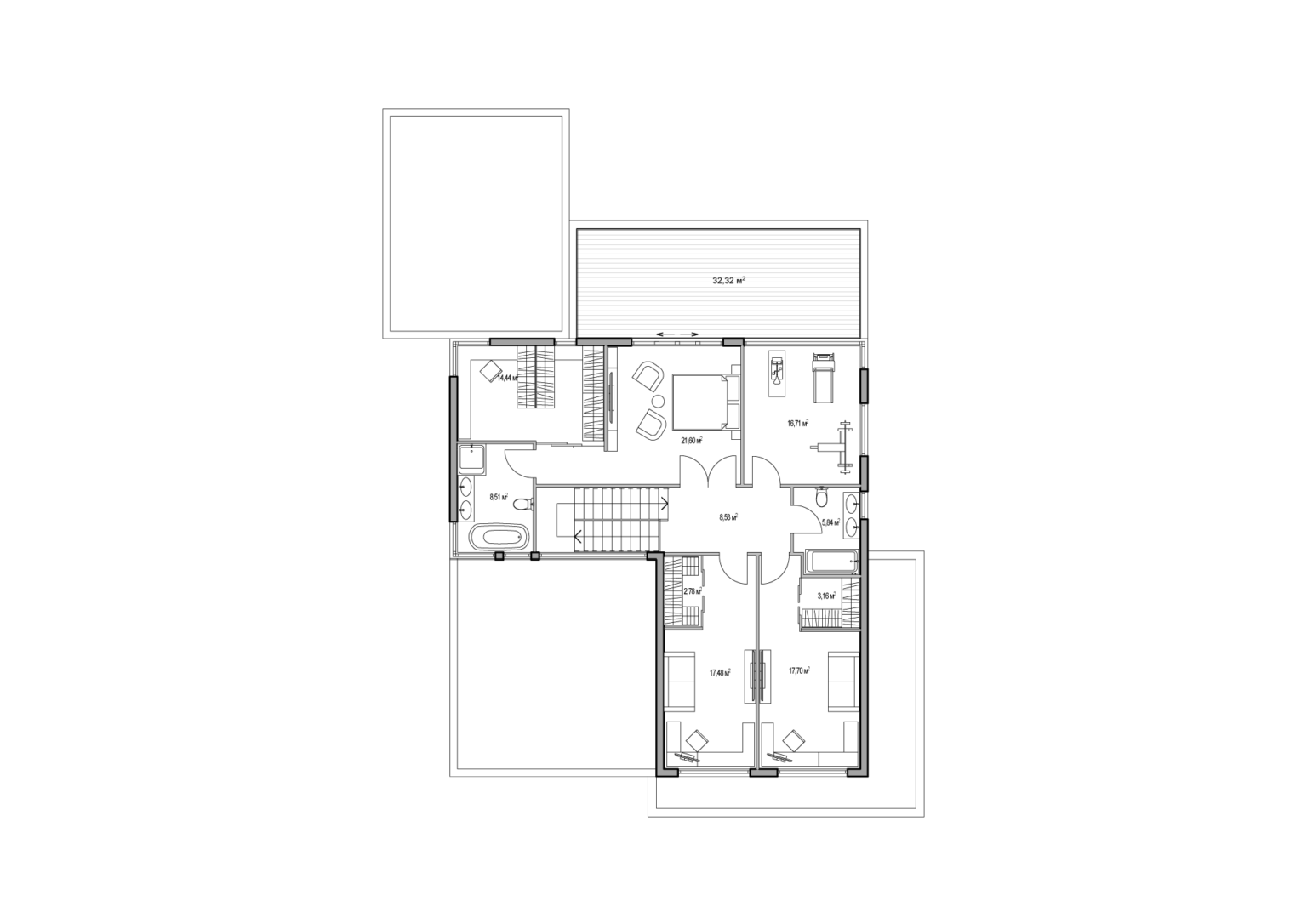 Другий поверх повністю приватний — тут знаходяться три спальні кімнати та спортзал. Мастер-спальня облаштована власним гардеробом, санвузлом та виходом на простору видову терасу.