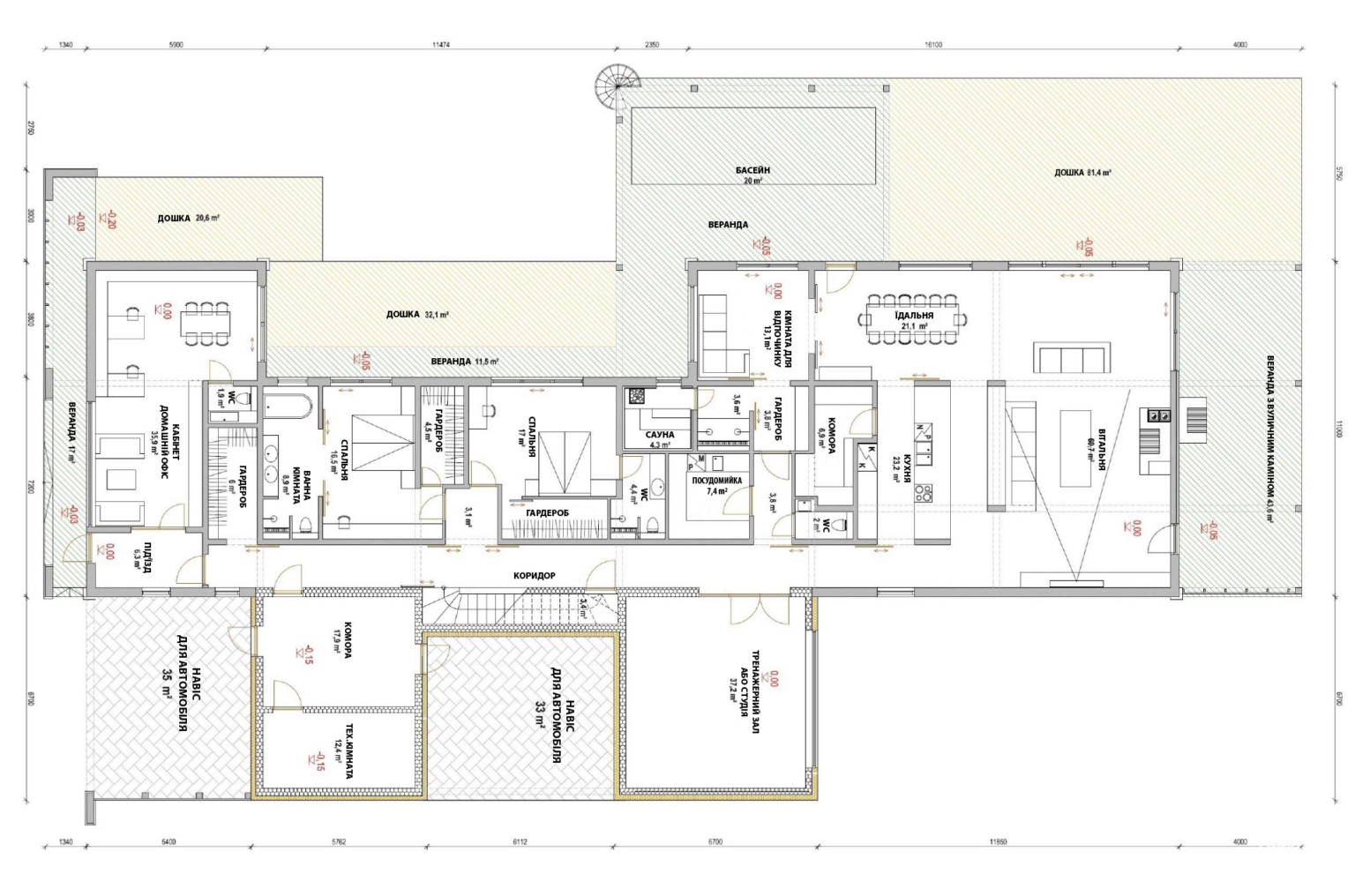 Між кухнею і спальнями розташований блок сауни, який через коридор з’єднується з простором спортзалу.