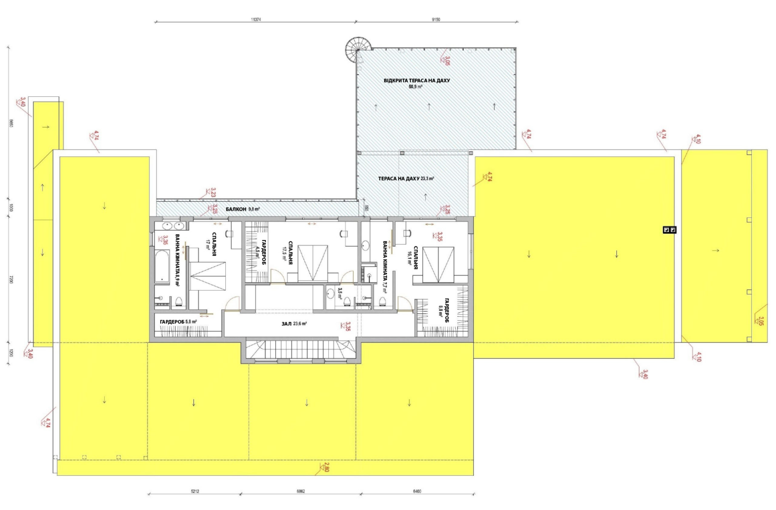 Додавши сходи, будинок можна розширити за рахунок часткового другого поверху зі спальнями, балконом і терасою на даху. Розмір другого поверху також можна варіювати залежно від необхідної площі та побажань власника.