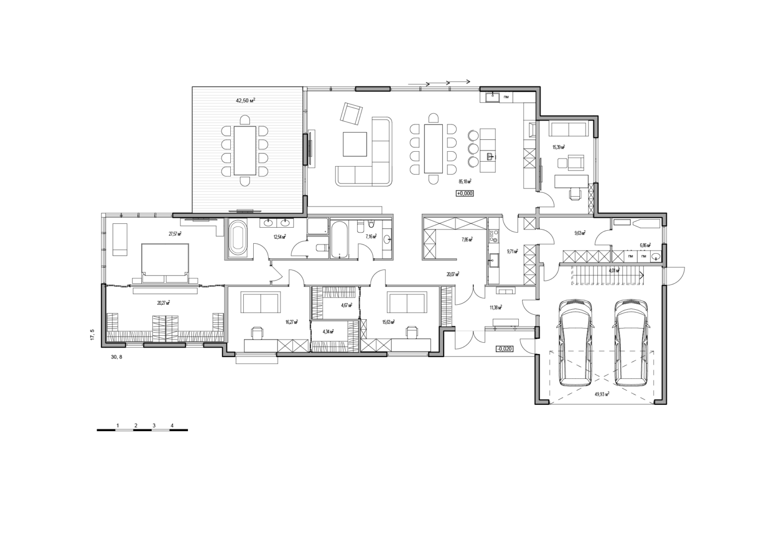 Велика вітальня будинку складається з трьох зон: простір для спілкування та відпочинку з каміном, їдальня та відкрита кухня, яка має додаткове приміщення для готування та зберігання. Вітальня має вищу за всі інші кімнати стелю і вікна по периметру для кращого освітлення. Звідси можна вийти на простору і водночас затишну терасу, у внутрішньому дворі.