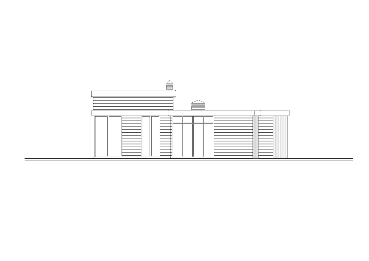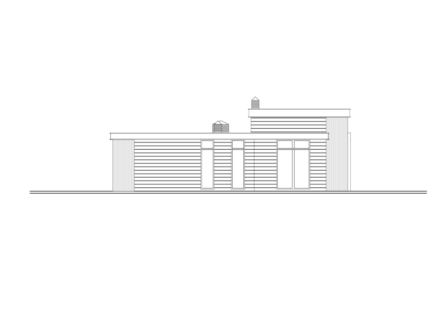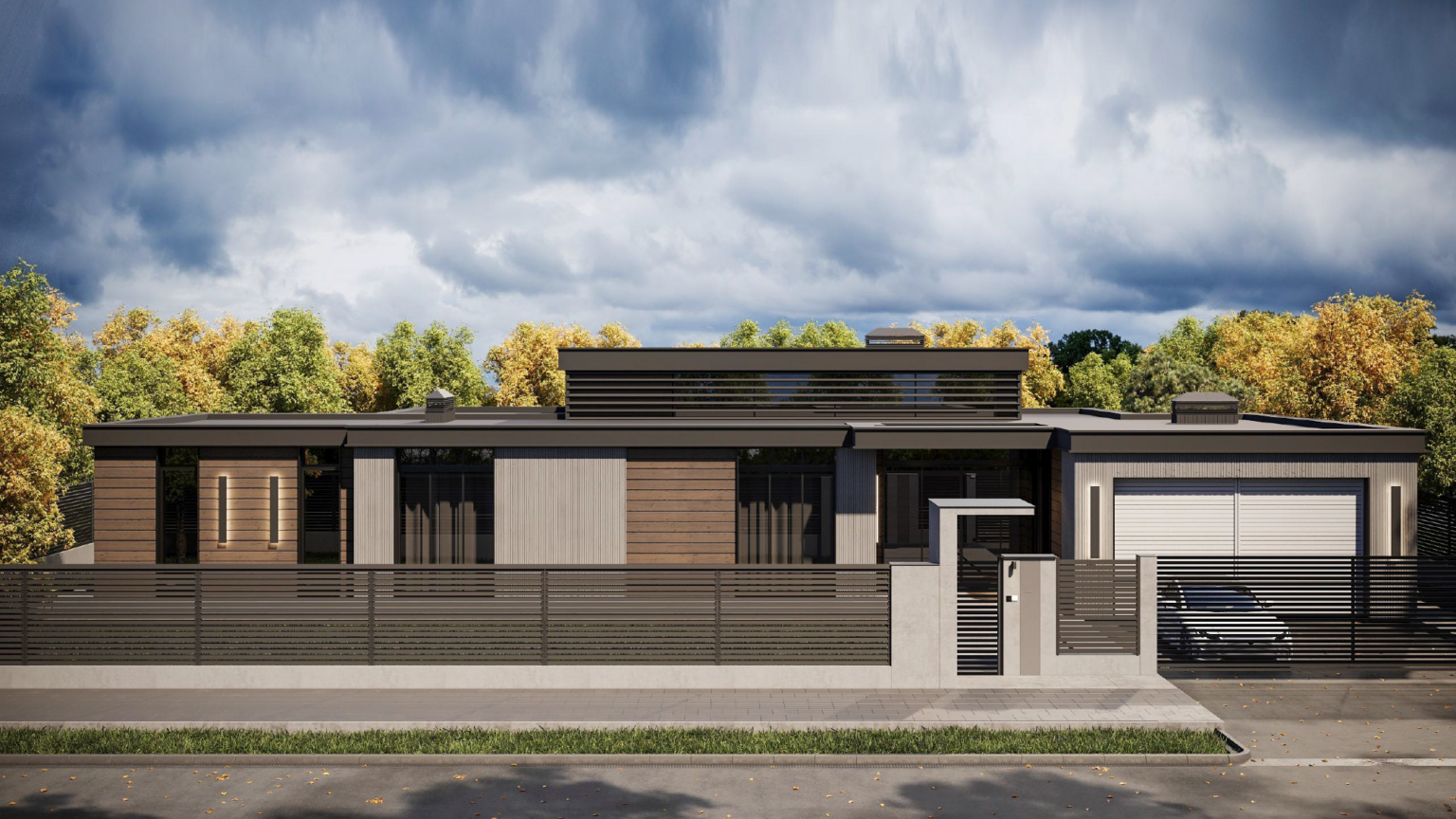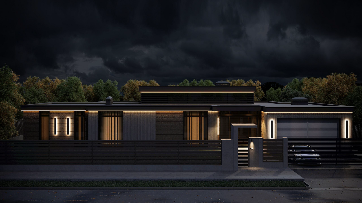 Кабінет виходить вікнами на головний фасад, та має вихід у двір. У холі розташований санвузол для гостей та підсобні кімнати. Під приміщенням гаражу передбачене укриття, розміри та наповнення якого залежать тільки від ваших потреб. Зона укриття спеціально облаштована з краю будинку, аби мати можливість зробити другий вихід на поверхню на віддаленні від основної будівлі.