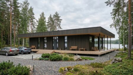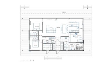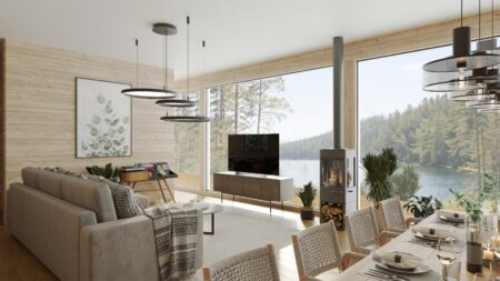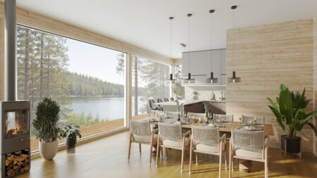 Проект дерев’яного будинку Uranus – це слушне рішення для шанувальників функціонального стилю, яке відмінно підійде для невеликої ділянки. Компактна форма поділяється на два рівні, які визначають архітектуру проекту. Що стосується планування, то всередині житлового будинку розташовані чотири спальні (одна з яких має окремий гардероб), вітальня, частина якої виділена як кухонний куточок, і їдальня, дві душові, додатковий туалет на другому поверсі та лазня. Крім того, заплановано технічне приміщення та комору з окремим входом. Завдяки тому, що у такій оселі продумано кожну деталь, кожен квадратний метр використовується оптимально. Велика площа, яку збудовано за допомогою скла, робить приміщення дуже просторими та світлими.